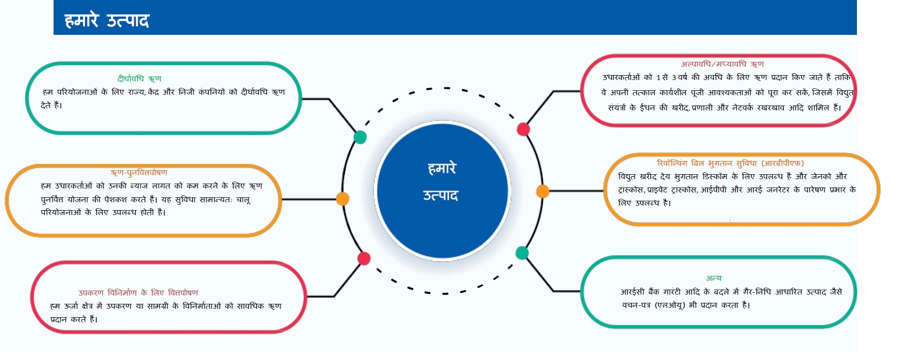 आरईसी देश में इन्फ्रास्ट्रक्चर परिसंपत्तियों के निर्माण के लिए राज्य, केंद्र और निजी कंपनियों को दीर्घावधि ऋण और अन्य वित्तपोषण उत्पाद प्रदान करता है। आरईसी निम्नलिखित क्षेत्रों का वित्तपोषण करता है: