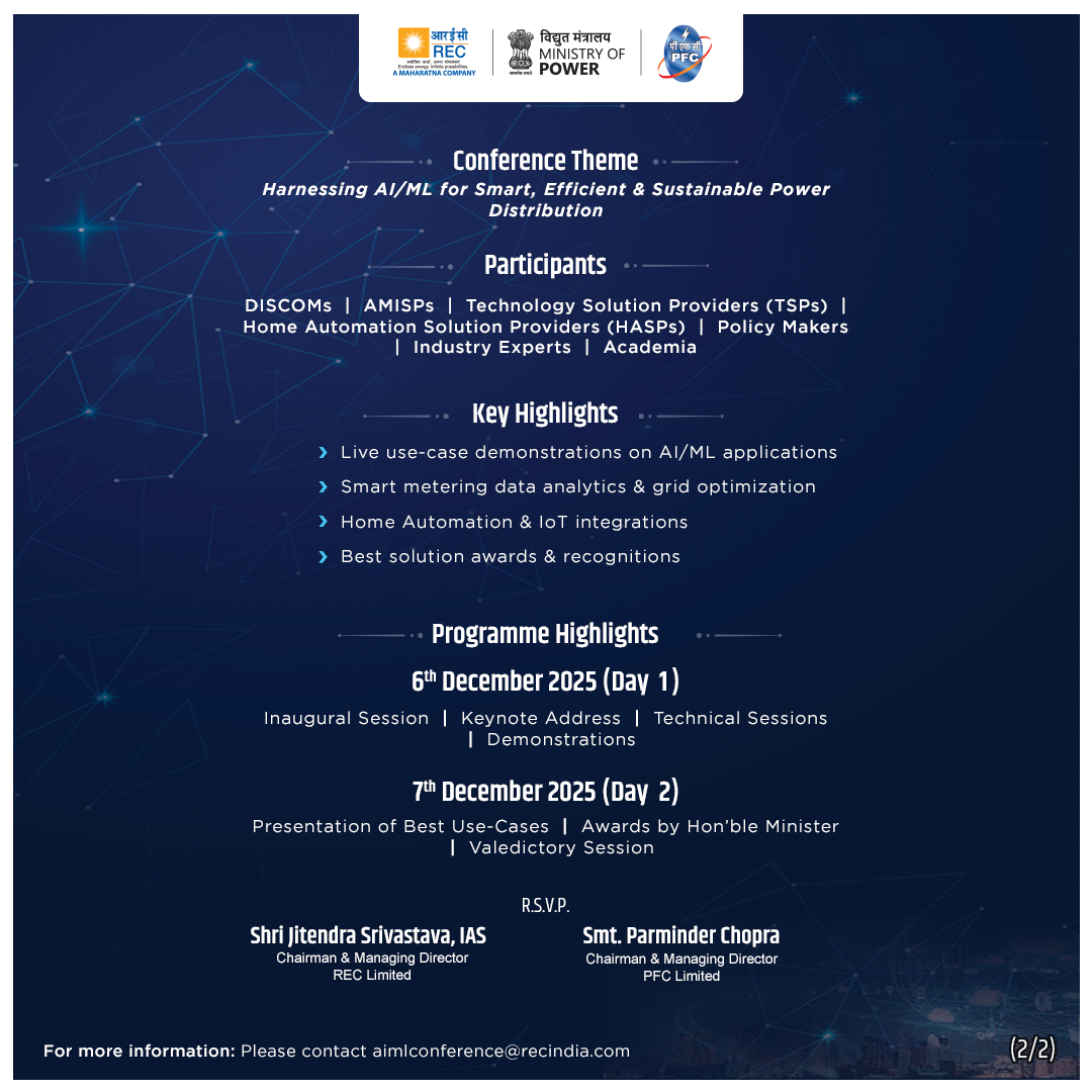 यह राष्ट्रीय सम्मेलन आपके नवाचारों को प्रदर्शित करने, उद्योग जगत के अग्रणी उद्यमों के साथ सहयोग करने और एआई/एमएल तथा स्मार्ट प्रौद्योगिकियों के साथ भारत के बिजली वितरण परिदृश्य को बदलने में योगदान देने के लिए एक अद्वितीय मंच है।
